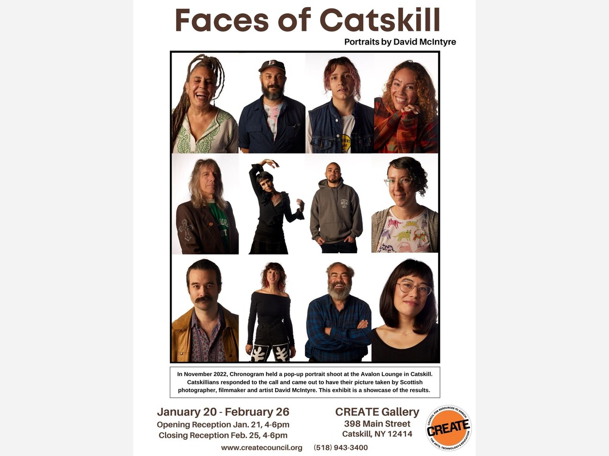 CREATE’s exhibit of David McIntyre’s Catskill portraits will run from January 20 until February 26 with an opening reception to be held on January 21 from 4-6pm and a closing on February 25 also from 4-6pm. McIntyre will present each one of his Catskill subjects with a print of their portrait. The CREATE Gallery is located at 398 Main Street in Catskill, NY.