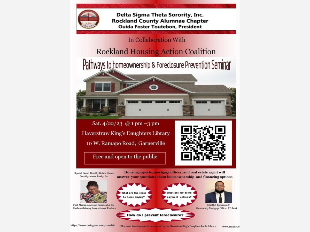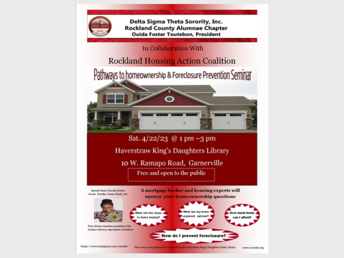 Delta Sigma Theta Sorority's Free Pathways to Homeownership & Foreclosure Prevention workshop. Co-sponsors: Rockland Housing Action Coalition, TD Bank, and Dorothy Jensen Realty, Inc. RSVP: https://www.eventbrite.com/e/pathways-to-home-ownership-and-foreclosure-prevention-seminar-tickets-598096431527