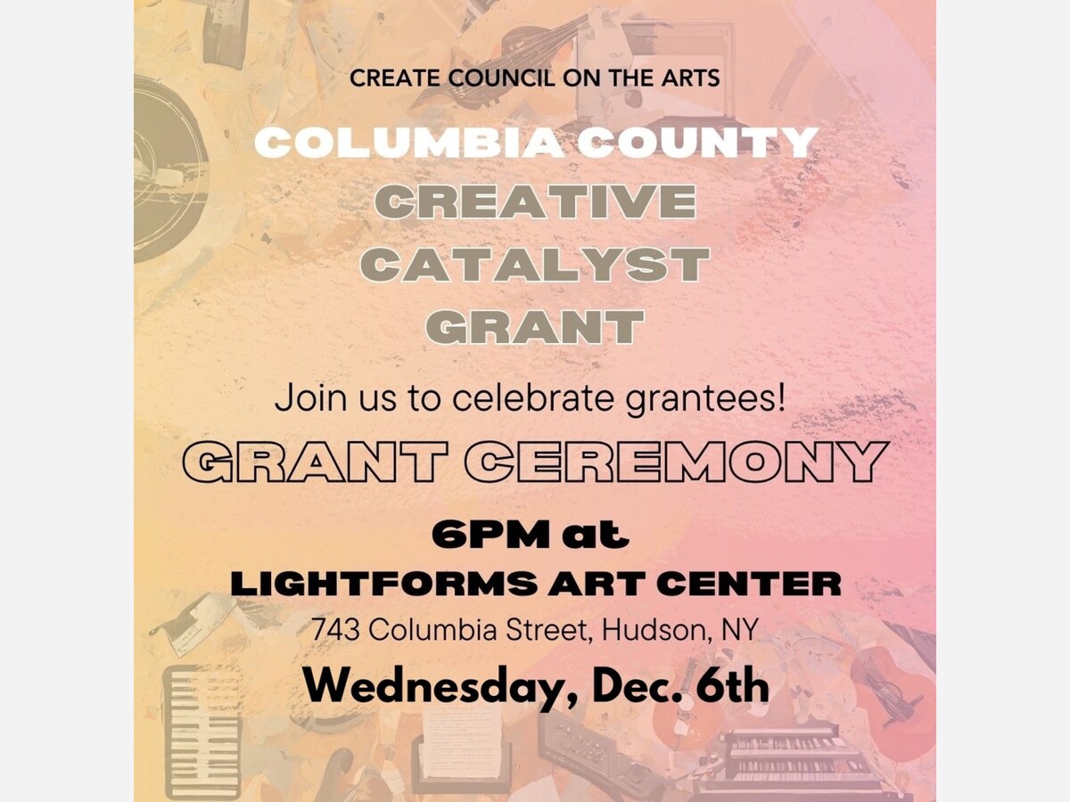 Nine working artists in Columbia County are set to receive individual grants of $1,000 each this week from CREATE Council On The Arts. The inaugural awards are the result of a new initiative sponsored by the Columbia County government to fund new work in the county. A ceremony will be held to honor grant winners at 6pm this Wednesday, December 6th at Lightforms Art Center, 743 Columbia St, Hudson NY. 12534 Light refreshments will be served.
