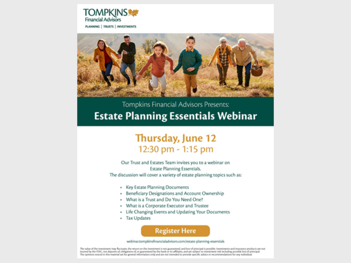 Register here: https://webinar.tompkinsfinancialadvisors.com/estate-planning-essentials