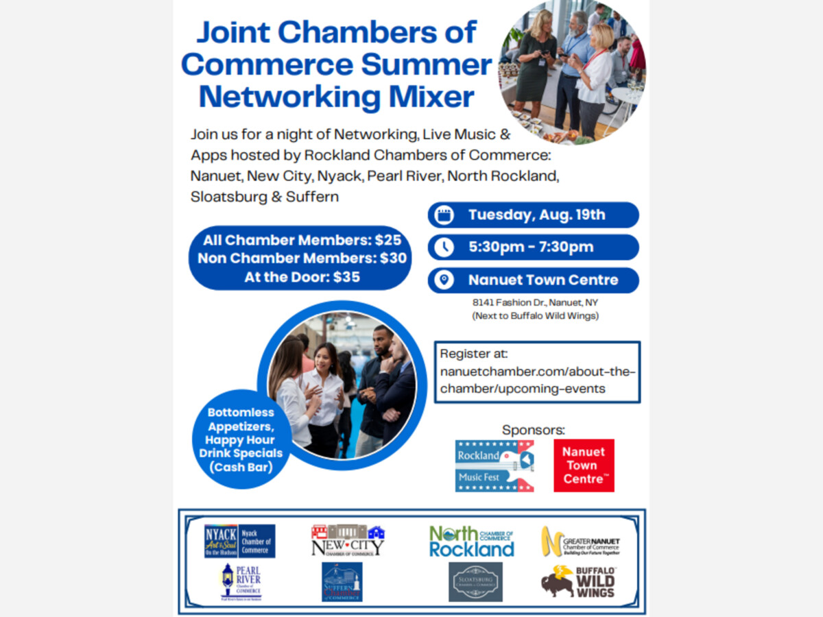 The Rockland Joint Chambers of Commerce are hosting a Chamber Alliance networking event at the Nanuet Town Centre, 8141 Fashion Dr, Nanuet (next to Buffalo Wild Wings on August 19th from 5:30 PM to 7:30PM. Buffalo Wild Wings will provide a bottomless assortment of appetizers.