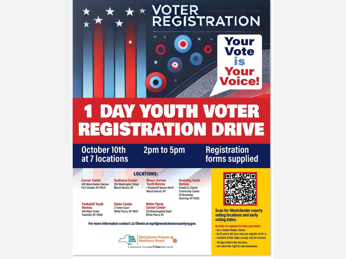The Westchester-Putnam Workforce Development Board, in partnership with Westchester County, is hosting a 1-Day Youth Voter Registration Drive on October 10th from 2 PM to 5 PM at seven locations throughout the county.