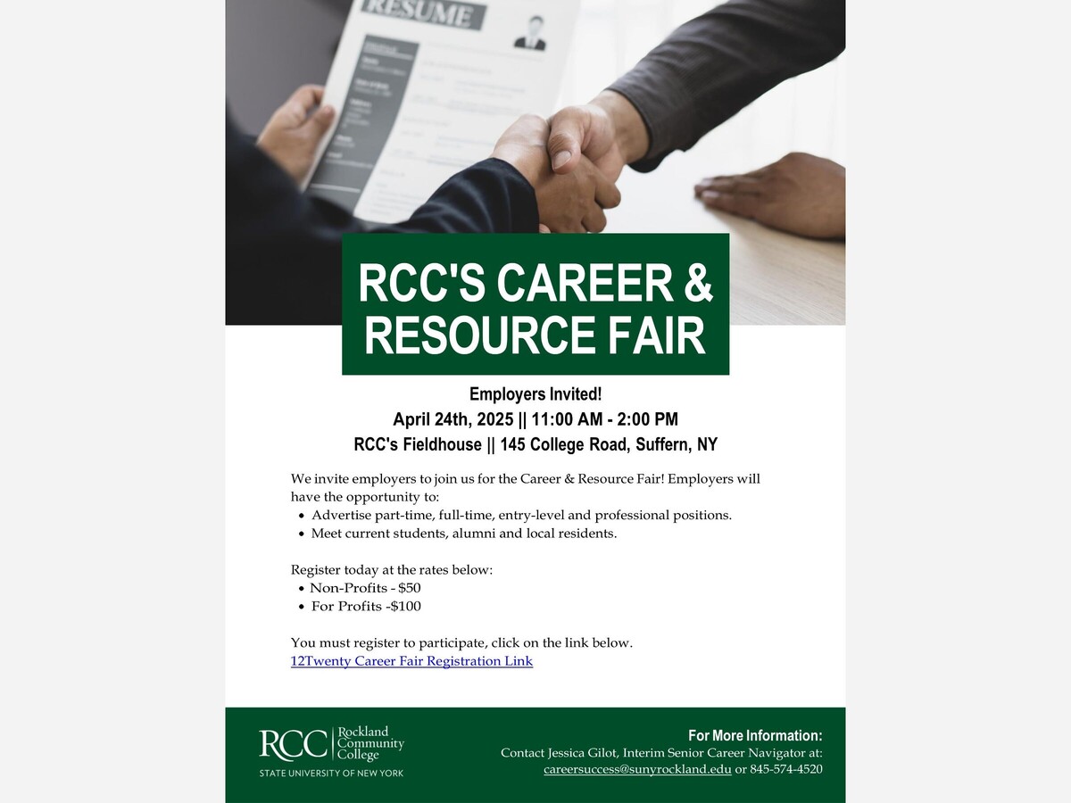 The Career & Resource Fair is free and open to all job seekers, and no registration is required for community members. RCC students must register in advance at this link: https://sunyrockland.12twenty.com/Account/Login?ReturnUrl=%2fevents%2f30006101250768