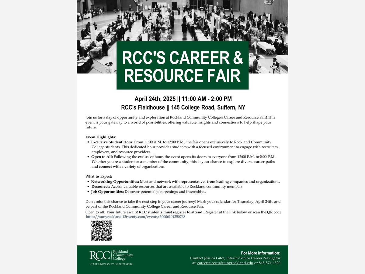 Rockland Community College will host its annual Career & Resource Fair on Thursday, April 24, 2025 from 11:00 am to 2:00 pm at the RCC Fieldhouse, 145 College Road, Suffern, NY. The event provides a valuable platform for employers to connect with talented students, alumni, and community members seeking employment opportunities.