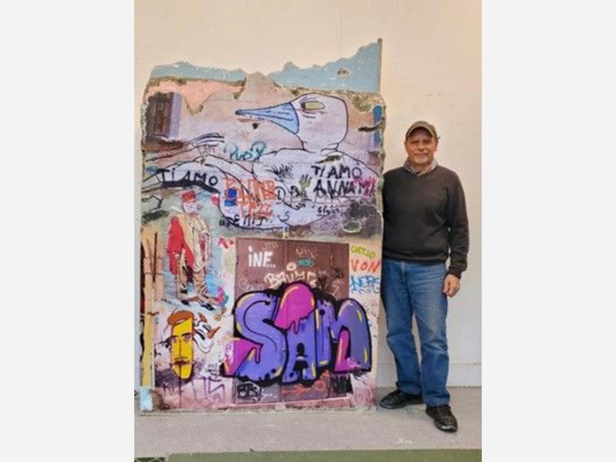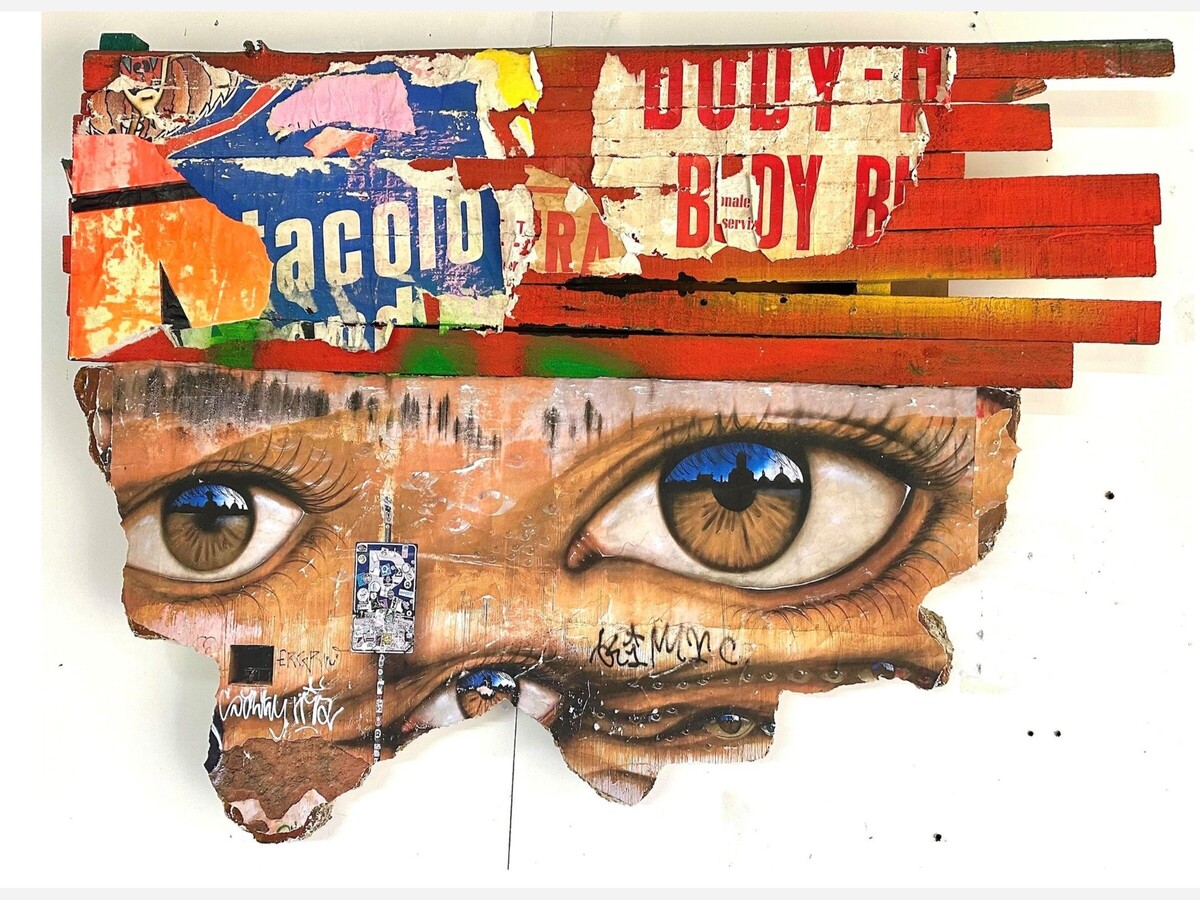 Palaia, who travels extensively, having visited over 25 countries so far, is an active muralist and sign painter, so he is naturally attracted to walls. He has photo-documented hundreds of urban walls, murals, graffiti, street art, signs, and posters and cataloged them by country. He then selects his favorite images and fabricates them from scratch more or less to life-size, but not with concrete. Palaia has devised a secret mix of materials that simulate the weight and texture of concrete. He combines four media in each piece; photography, painting, sculpture, and architecture. Palaia’s Urban Archeology exhibition includes simulated wall fragments from Italy, France, Cuba, London, Gaza, Berlin, and the U.S., as well as imaginary visions of prehistoric cave paintings from 40,000 years ago, painted on car parts and plastic jugs. Visitors will be transported to faraway places and times ahead of our current era.