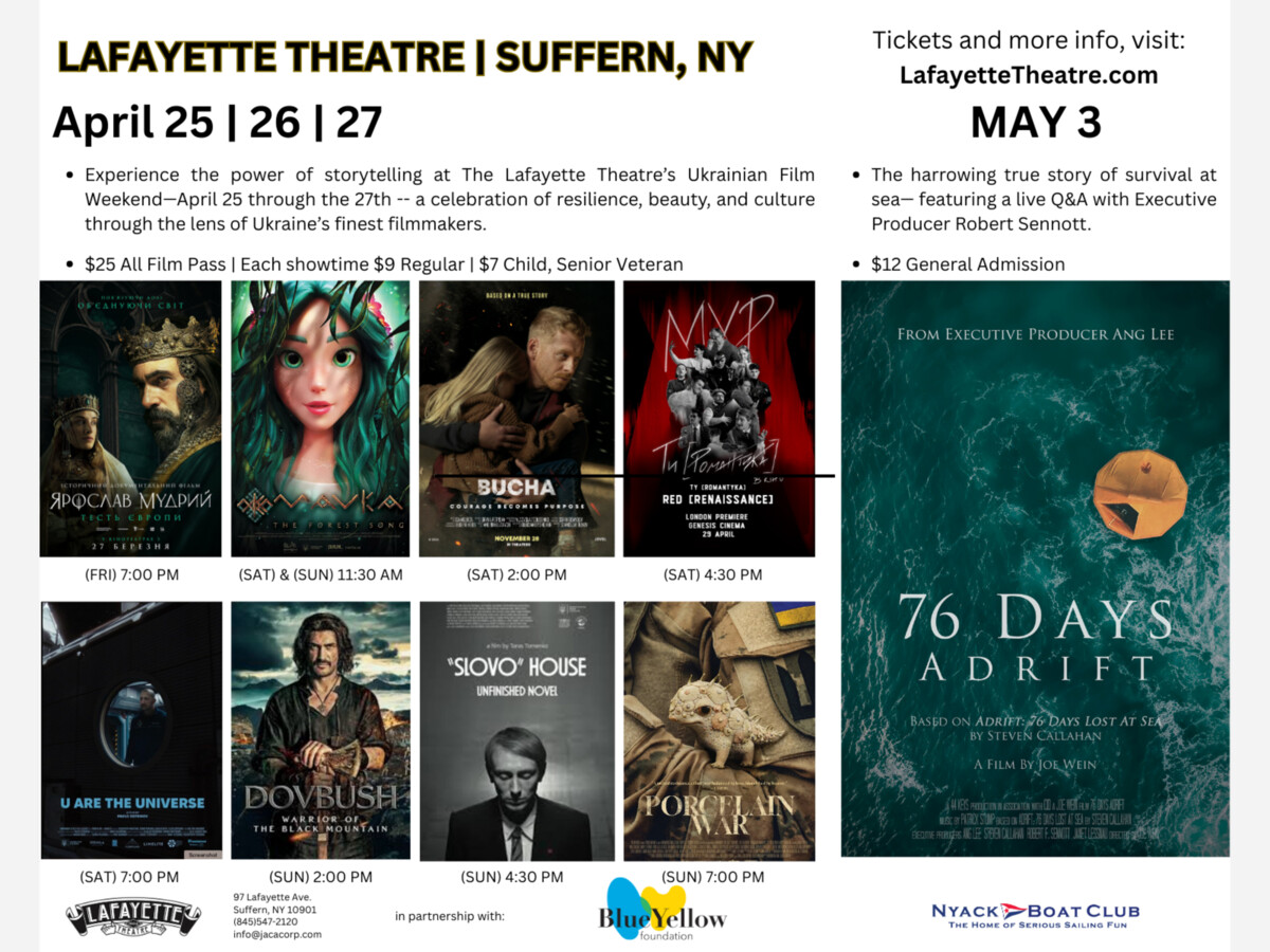 The historic Lafayette Theatre is proud to present two compelling cinematic events that highlight strength, resilience, and the enduring human spirit. From April 25 through April 27, filmgoers are invited to experience Ukrainian Film Weekend, a three-day cultural celebration in partnership with The Blue & Yellow Foundation, followed by a special one-night-only screening of 76 Days Adrift, presented in collaboration with The Nyack Boat Club and featuring an exclusive in-person appearance by Executive Producer Robert Sennott.