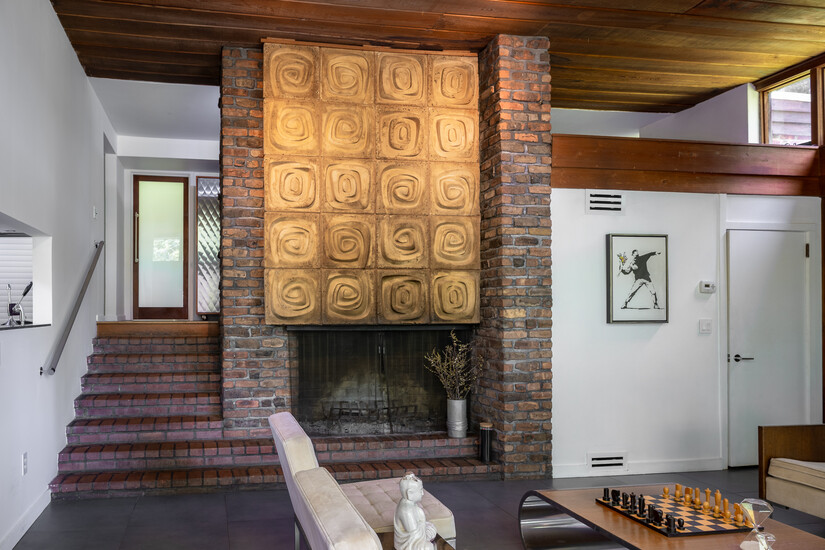 The design reflects a vision of modern domestic life. The home’s focal point is a brick hearth topped by a concrete relief, crafted by the Bookstabers, offering a centerpiece that unites the open-plan living space.