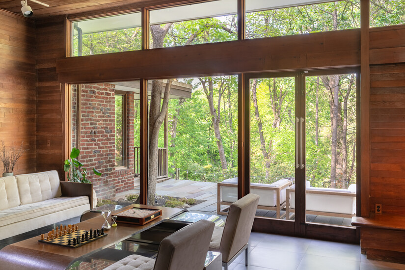 Floor-to-ceiling windows in this Frank Lloyd Wright-inspired home designed by Edgar Tafel. Photo: Andrea B. Swenson“With its fusion of functionality and artistic intent, the residence is a rare embodiment of Tafel’s architectural philosophy, that a home should mirror the soul of its owners,” said Marjorie Galen, listing agent for Ellis Sotheby’s International Realty. "This home is more than just a place to live; it’s a piece of architectural history that continues to evolve while staying true to its original vision."