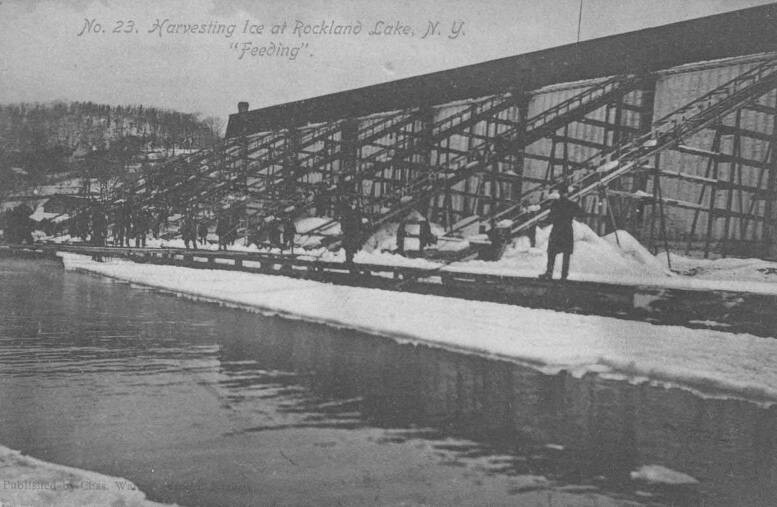 Men pulling ice from Rockland Lake for harvesting. The huge mechanism on the right is used to break the ice from the lake, where it moves up the conveyor belt to be stored. Courtesy of the Historical Society of Rockland County, New City, NYThe Palisades Interstate Park Commission later purchased private parcels Rockland Lake State Park opened in 1965. Ice house ruins were all that remained.