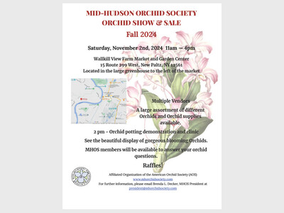 Nanuet event Sat Nov 2 12:00 am Mid HUdson Orchid Society 2024 Fall Orchid Show & Sale Saturday, November 2nd from 11 am to 4 pm Join us for the Mid Hudson Orchid Society Fall 2024 Orchid Show & Sale at Brenda Decker Hudson Valley News & Events